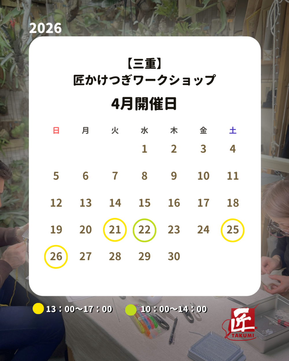 4/21(火)13:00〜17:00 満員