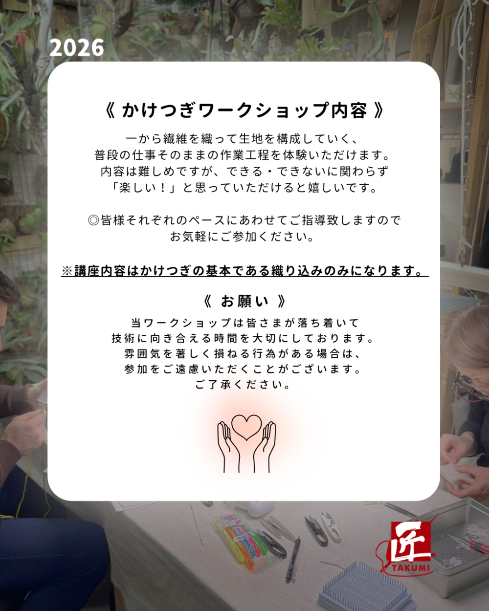 『匠かけつぎワークショップ事務局』までメールにてご連絡ください。