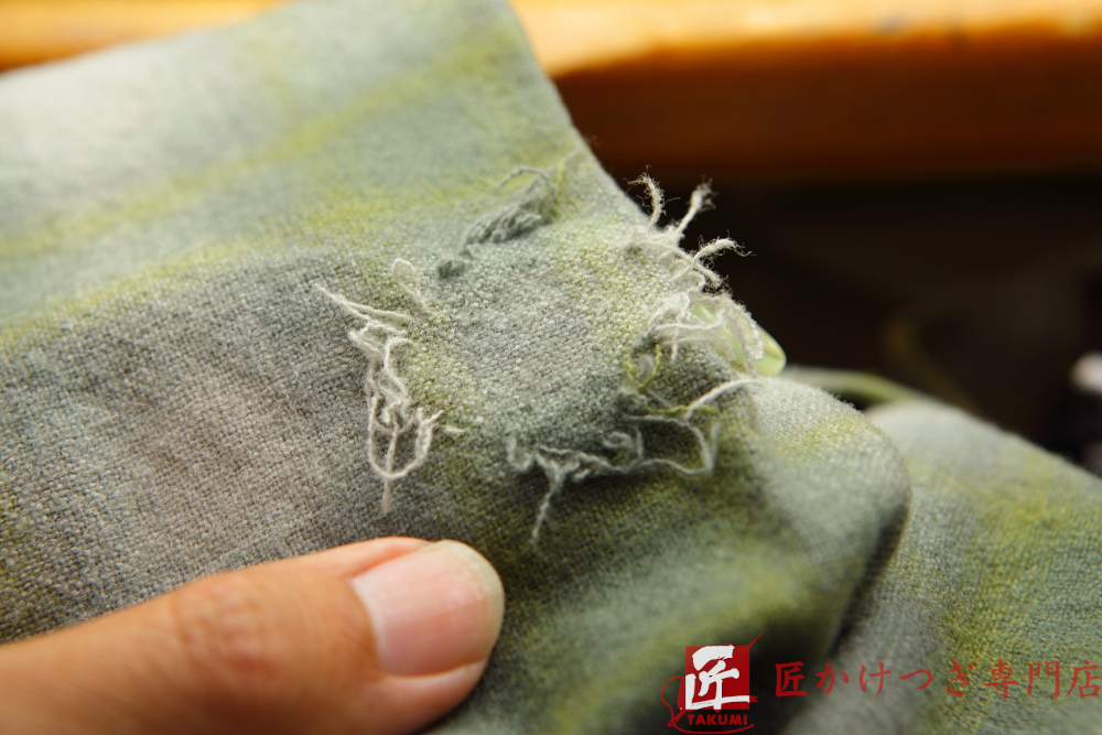 太めの繊維の場合は一本ずつ織っていく方法で修理をします。