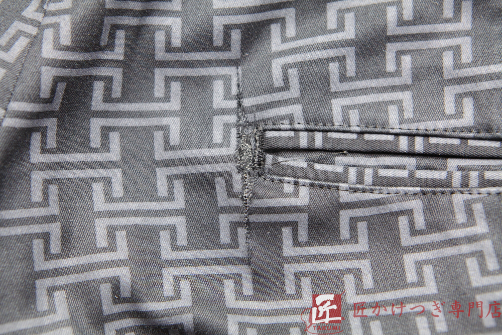 スーツズボン 30mm以上 2026.01.11 後ポケット口の破れ(プリント生地) BEFORE AFTER 修理内容スーツズボン ポケット口の破れ かけつぎ(かけはぎ)修理 穴の大きさ 30mm以上 修理料金27,500円 修理日数60日 ※当店の状況によります スタッフよりコメント スーツズボン ポケット口の破れです。 この部分は破れやすいのでご依頼が多いです。 今回プリント生地のため、柄を合わせることを最優先で作業しております。 生地が固く作業が大変でした。 (千葉県N様 ありがとうございました。)