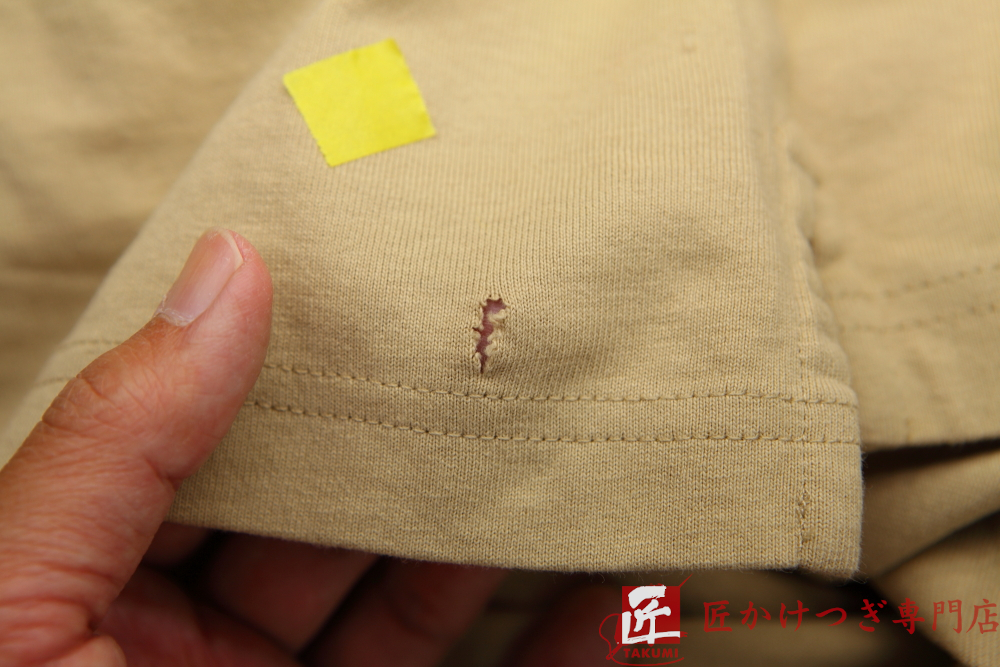 Tシャツ 9~15mm以下 2026.03.04 Tシャツの穴修理 BEFORE AFTER 修理内容Tシャツの穴 かけつぎ(かけはぎ)修理 穴の大きさ 9~15mm以下 修理料金11,440円 修理日数60日 ※当店の状況によります スタッフよりコメント 穴の大きさで修理方法は変わりますが、 今回は裾折り返し裏部分より、四角に少し四角に取った生地を移植しました。 (千葉県M様 ありがとうございました。)